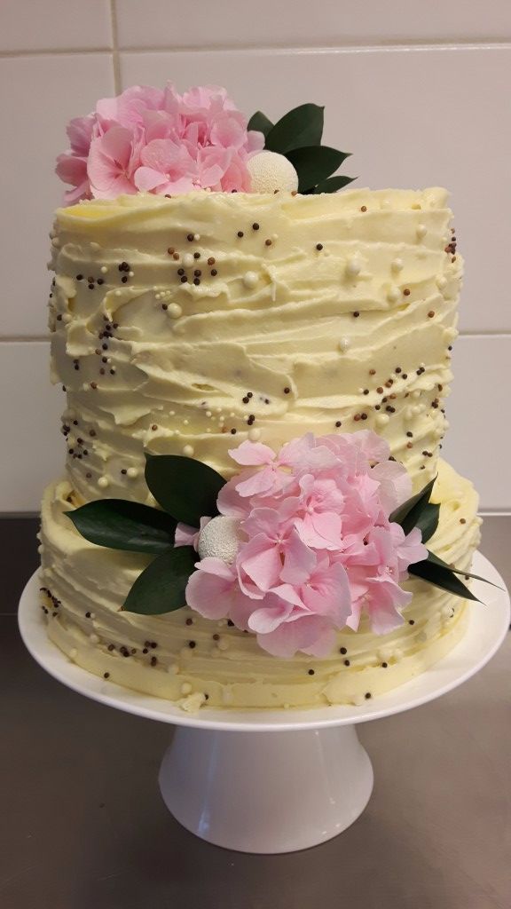 Poročna torta je premazana z vrhunsko kremo iz kremnega sira. Torta je s svojo kuštravo pojavo nekaj posebnega.