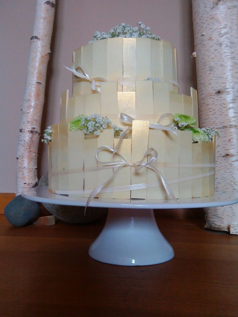 SImpatična poročna tortica, oblečena v tablice bele čokolade na keramičnem podstavku.