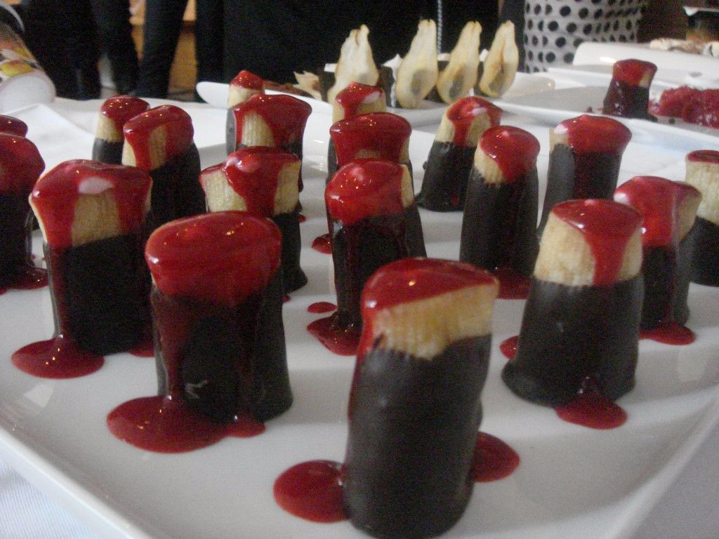 Široke Italijanske testenine, polnjene s čokoladnim moussom v malinini omakci.